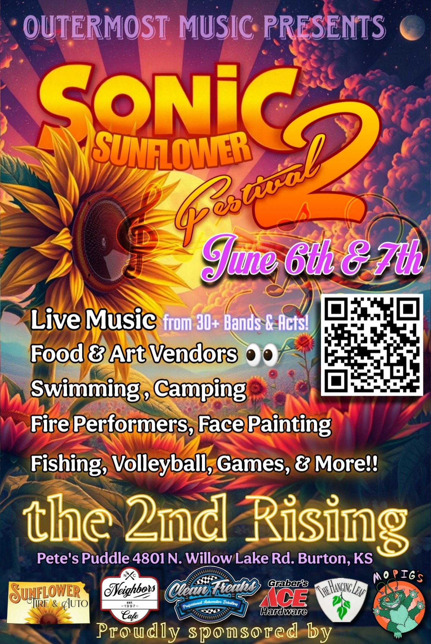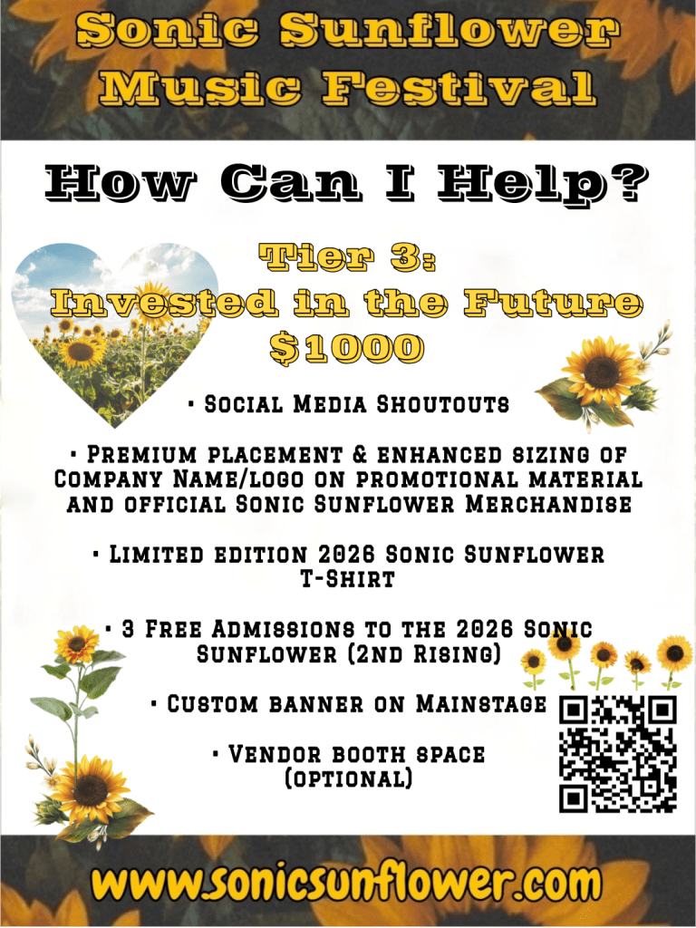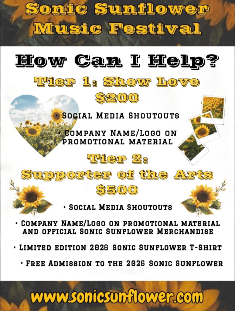 Sponsorship funds are used to pay the local artists and musicians involved. It also goes to helping provide a safe and fun environment for those attending! Our goal is to become one of the biggest music and arts festivals in Kansas, as well as providing a community for local artists and musicians to flourish! We’d appreciate your partnership in bringing this to life each year! For any questions please email us at sonicsunflowerfest@gmail.com!